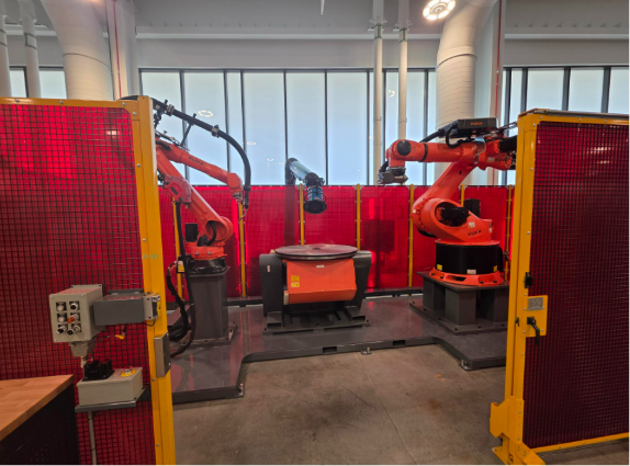 - Side-by-Side Additive and Subtractive: Utilizing both robotic wire-arc additive manufacturing (KUKA KR50 R2500) and a heavy-duty 5,000 lb capacity 2-axis positioner allows for complex additive depositions to existing parts and machining down to finish in a single machine.